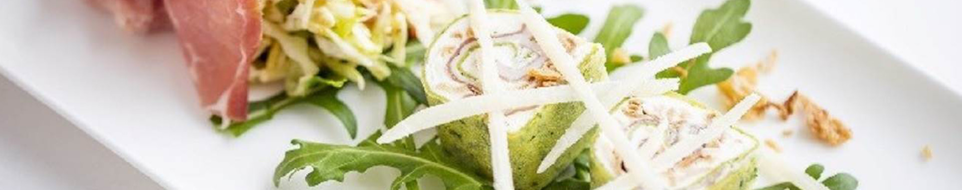 Gefüllte „Kräuterflädle“ mit Prosciutto di San Daniele, Frischkäse, Röstzwiebelpesto, Krautsalat und Grana Padano