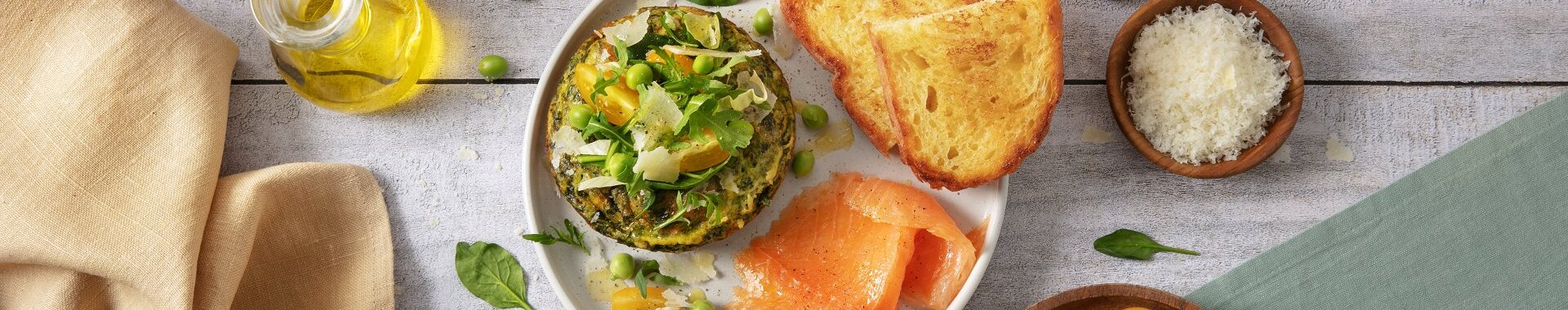 Die Omeletts mit dem Salat servieren und mit gehobeltem Grana Padano garnieren. Mit Räucherlachsscheiben und geröstetem Brot anrichten.