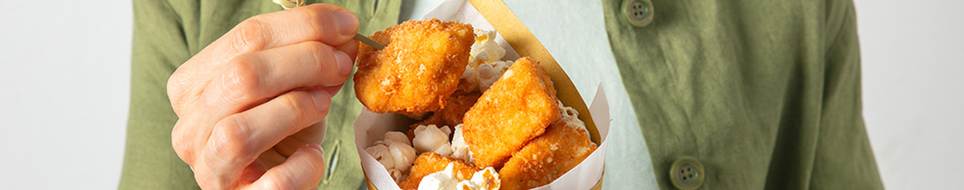 Frittierte hähnchenstücke, mit popcorn und grana padano in der pergamentpapiertüte