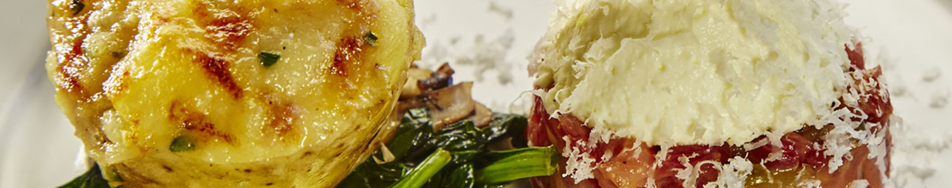 Für das Grana Padano Mousse: 150 ml Milch 75 ml Gemüsebrühe 150 ml Sahne 50 ml Mascarpone 225 g geriebener Grana Padano 1 Zitrone 4 Blätter Gelatine Thymian, Rosmarin Schwarzer Pfeffer Für die Grappakartoffeln: 5 große mehlige Kartoffeln 2 Paprika (rot & gelb) 2 rote Zwiebeln 225 g geriebener Grana Padano 50 g Olivenöl 25 g Kapern 100 g Champignons 50 g Creme Fraiche 100 ml Grappa 700 g frischer Spinat 75 g Schalottenbrunnoise 25 g Butter 50 g piemonteser Haselnüsse 1 Knoblauchzehe Tabasco Getrockneter Majoran Für den Tartar (optional) – alternative: Ratatouille von Wintergemüse: 500 g zuparierter Rinderrücken 40 g Gewürzgurken 25 g Schalottenbrunnoise 2 Eigelb (Bioqualität) 5 g Sardellen 25 g Olivenöl 30 g Tomatenketchup 15 g gehackte Kapern 15 g Senf Salz & Pfeffer