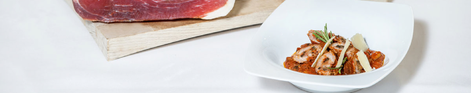 Schinken, Tomaten, 4 EL Oliven klein schneiden; Rosmarin zupfen und fein hacken. Alles mischen. Die Rouladen auf die Arbeitsfläche legen und mit Salz und Pfeffer würzen. Mit der Füllung bestreichen, aufrollen und mit einem Holzspieß feststecken. Zwiebel und Knoblauch schälen und fein hacken. Restliche Oliven grob schneiden.