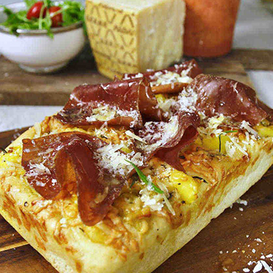 Für den Pizzaboden: 350g ’00’ Mehl (Wenn nicht vorhanden, kann auch anderes Mehl verwendet werden.) 2 EL Olivenöl 1 TL schnell wirkende Trockenhefe 1 TL Salz 240 ml Wasser (lauwarm, nicht heiß) Für das sonnengetrocknete Tomatenpesto: 8-9 sonnengetrocknete Tomaten (+ ein Teil des Öls, in dem sie gelagert werden) 1 Knoblauchzehe Eine Handvoll frische Basilikumblätter 1 EL geröstete Pinienkerne 30g geriebener Grana Padano Käse Salz und Pfeffer Für die anderen Beläge: 150 g geriebener Grana Padano Käse Einige Kirsch- oder Babypflaumetomaten Ein paar Oliven 1 frische rote Chilischote (verwenden Sie mehr oder weniger, je nachdem wie scharf Sie Ihre Pizza sein sollte) Ein paar Scheiben Prosciutto di San Daniele Eine Handvoll frischer Rucola