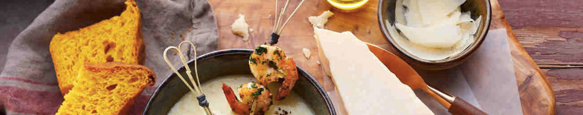 Die Garnelen waschen, trocken tupfen und mit Salz und Pfeffer würzen. Das übrige Olivenöl in einer Pfanne erhitzen und die Garnelen darin von beiden Seiten ca. je 2 Minuten braten. Die Knoblauchzehe schälen, fein hacken und gegen Ende der Bratzeit zusammen mit der Petersilie zu den Garnelen geben und durchschwenken. Die Suppe noch einmal mit einem Stabmixer aufschäumen, in tiefe Teller füllen und je 2 Garnelen mittig darin platzieren. Das frische Kürbisbrot in Scheiben geschnitten separat dazu reichen. Nach Belieben mit den Grana-Padano-Spänen garnieren und servieren.