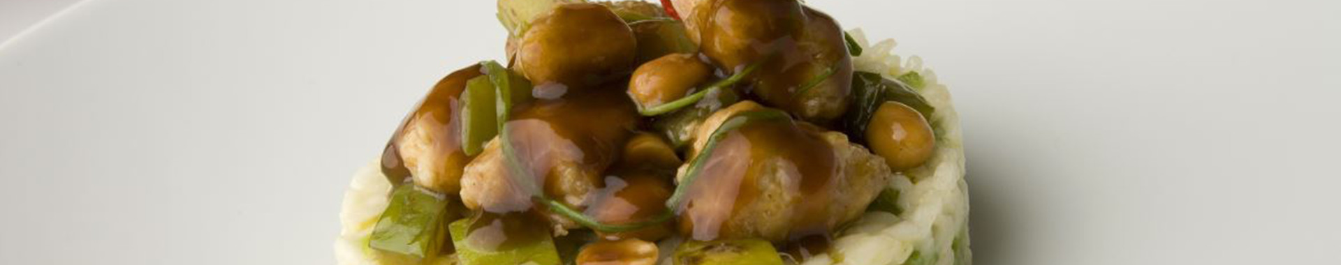 Stir-fried pork cubes with Carnaroli rice timbale and green peppers