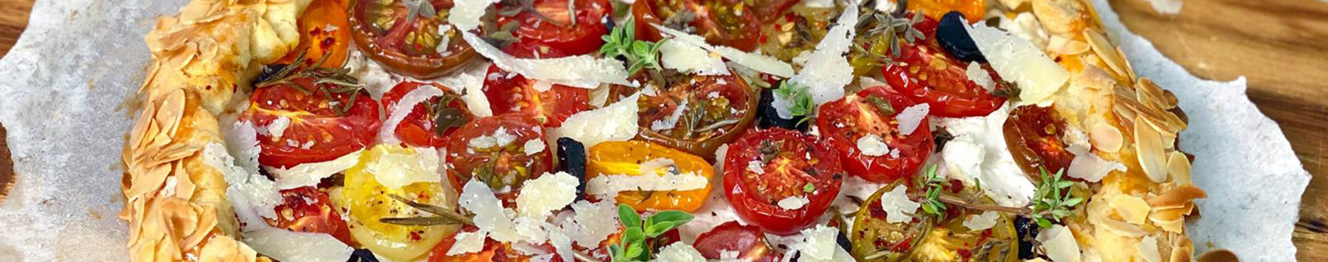 Den kalten Teig auf einem Bogen Backpapier kreisförmig ausrollen. Die Ricottacreme darauf verteilen, anschließend die halbierten Tomaten, den Knoblauch und die Kräuter darauf verteilen, alles mit Chili Salz und Pfeffer bestreuen. Den Rand nach innen einklappen, mit verquirltem Ei bestreichen und die Mandelblättchen aufstreuen.