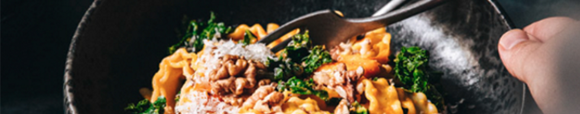 Nudeln mit Kürbissoße vermischen, Grünkohl dazugeben. Kurz vor dem Servieren mit gehackten Walnüssen und mit geriebenem Grana Padano bestreuen.
