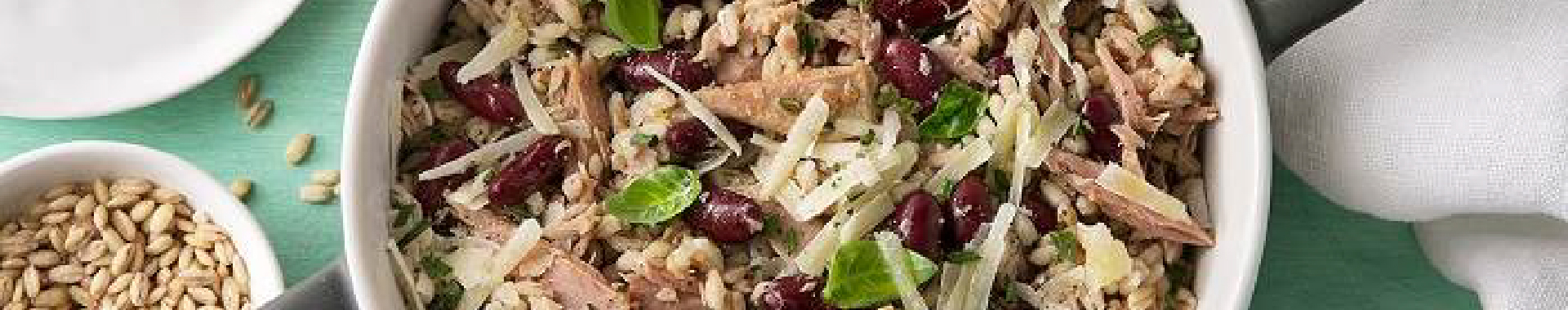 Graupen in eine Schüssel geben, abgetropften Thunfisch, Bohnen und geriebenen Grana Padano, Schnittlauchröllchen und Basilikumblättchen hinzufügen. Vorsichtig etwas natives Olivenöl extra untermischen und mit Salz abschmecken.