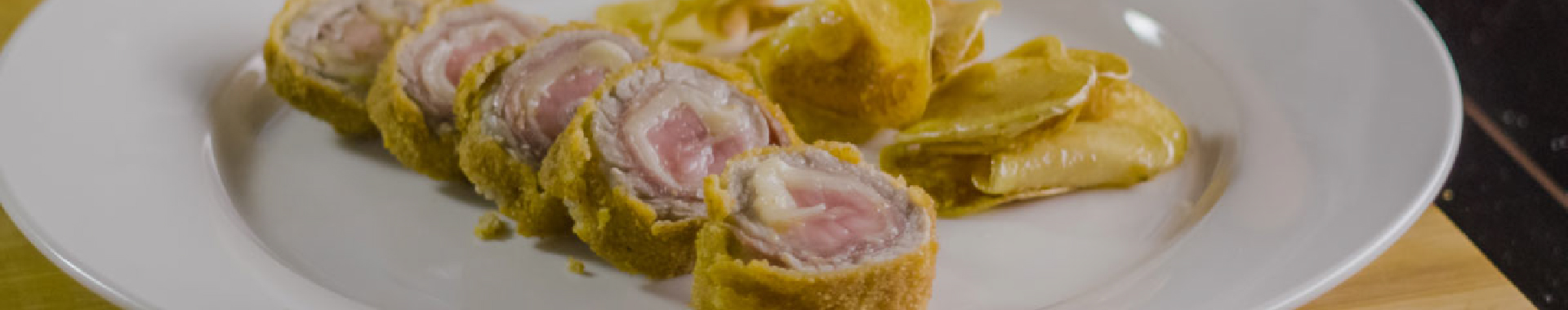 Place the prosciutto slices and Grana Padano shavings over the slices of veal, then roll them and cover each parcel first in flour, then in the eggs and finally in the breadcrumbs. Fry at 160°C for at least 3-4 minutes.