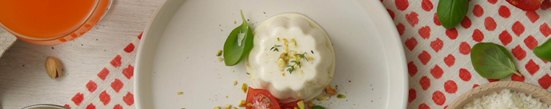 Remove the panna cotta from the moulds and serve immediately with the plum tomatoes, chopped pistachios, basil and a drizzle of olive oil, if wanted.