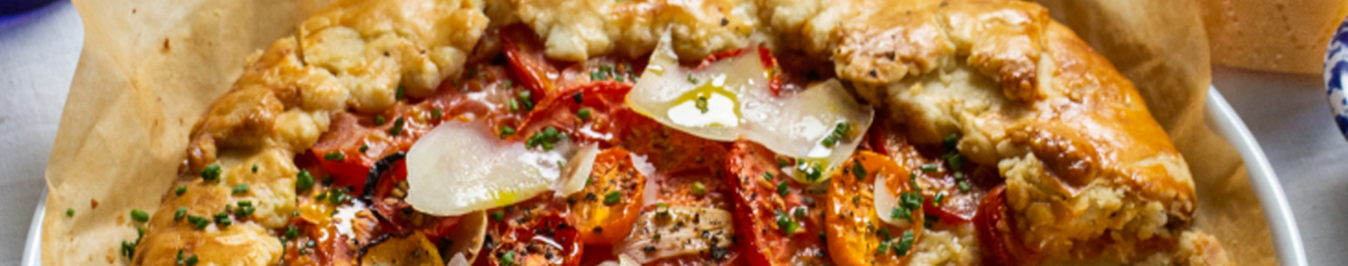 2 cups all purpose flour, plus a little extra for dusting 2 tsp salt 170g butter cold, cubed 1 egg beaten 1 large onion, sliced 1 tbs butter 2 tbsp dijon mustard Squeeze of lemon Pinch of salt 700g ripe tomatoes, combination of colours if possible 2 garlic cloves, very thinly sliced 1 cup Grana Padano, plus extra for ganish 2 Tbsp finely sliced chives To serve Fresh rocket