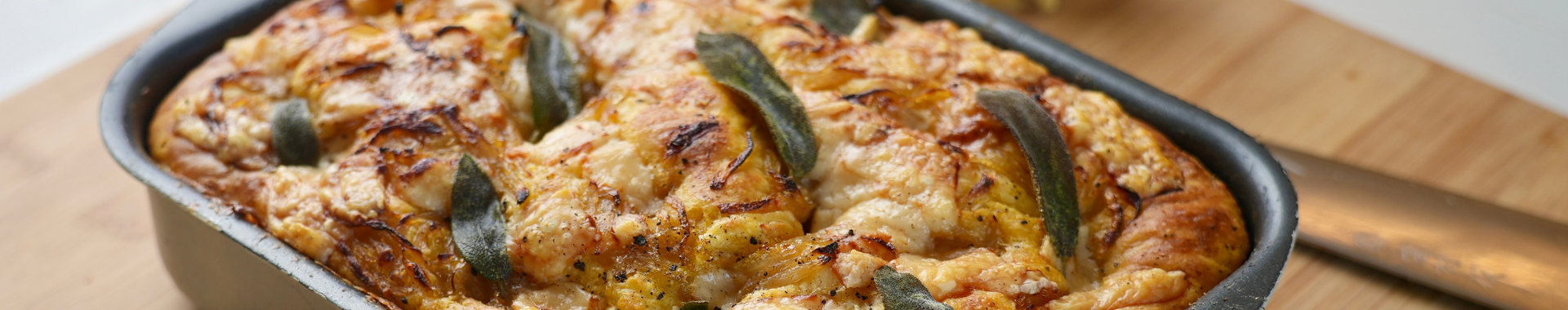 Well, it worked out a treat and everybody absolutely loved it. Finding little spots of sweet potatoes while you bite made a huge difference and the idea of adding savoury Grana Padano cheese, caramelized onions and sage came along the way and it was a brilliant one if I can say it myself! Soft fragrant focaccia, delicious served warm, even the day after (keep it in the fridge)