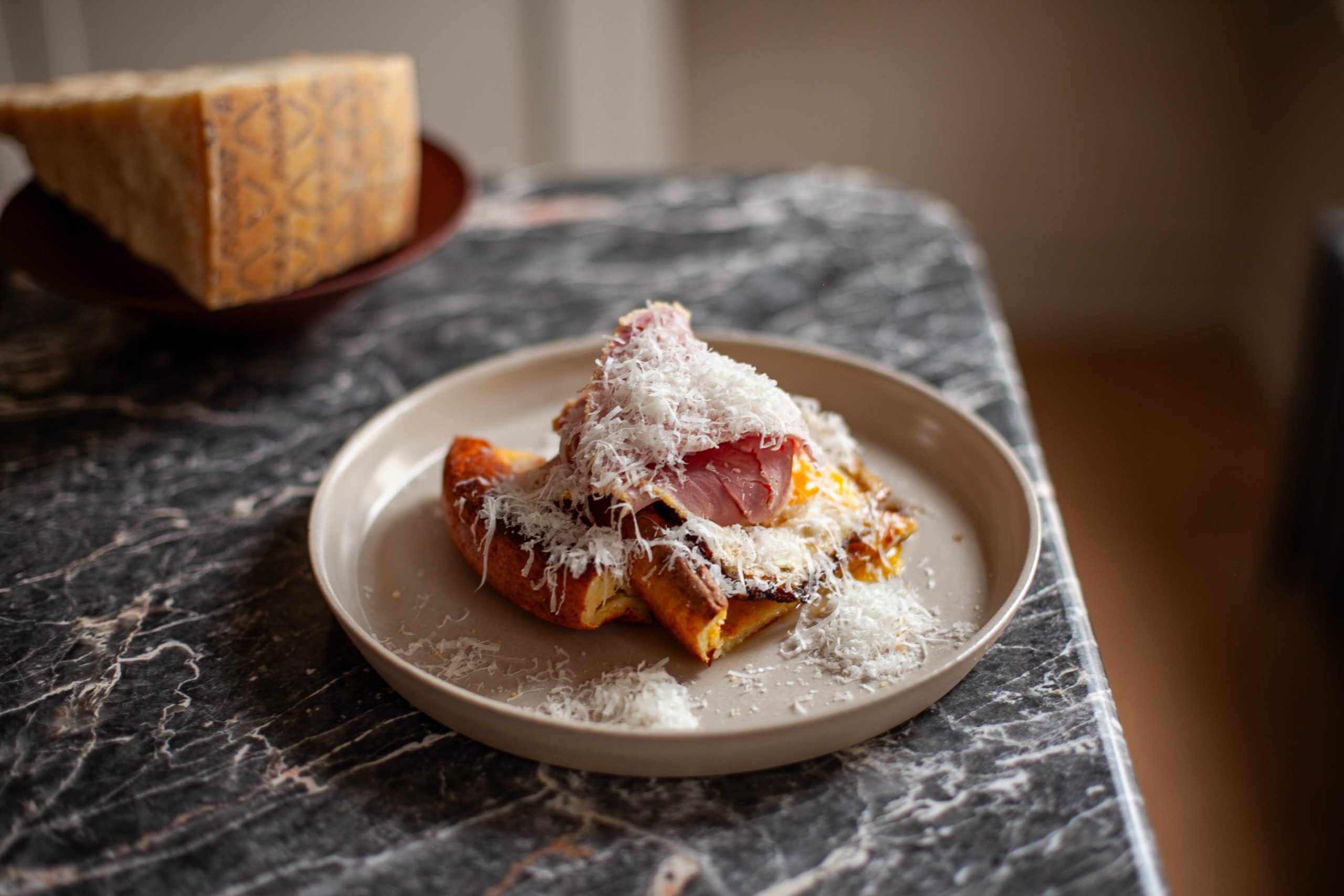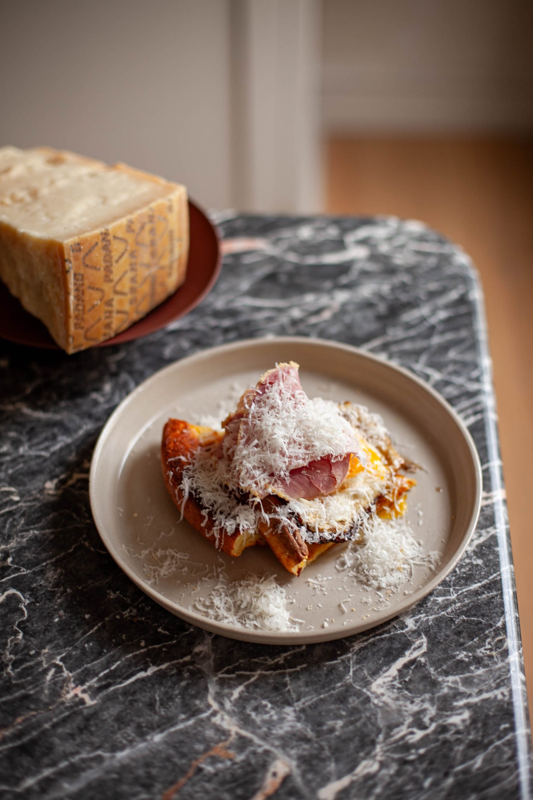 Serve with a slice or two of quality ham, fried egg and most importantly of all a very generous smattering of Grana Padano. Serve with a several turns of fresh pepper.