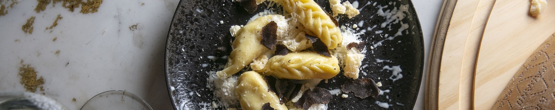 The filling is still with potatoes, but it is dressed with olive oil and loads of grated Grana Padano Riserva, which is Oltre 20 Mesi. The longer aged cheese has richer flavour and it gives a nice oomph to the filling. The dressing of the plate will simply be a Grana Padano sauce with black truffle covering the aromatic element of the recipe. Very few ingredients but lots of flavour assured!