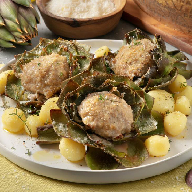 Lightly fry the onion in 2-3 tablespoons of olive oil then add the meat, browning it before adding the white wine. Season with salt and add the chopped artichokes. Complete with a tablespoon of thyme leaves.