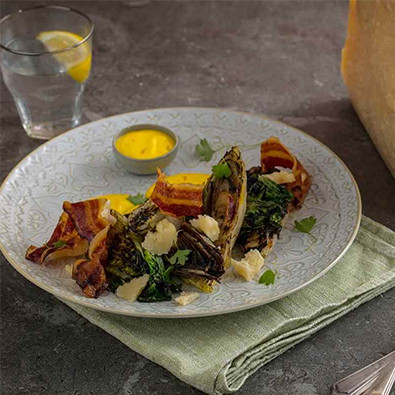 In a mixer, blend the prosciutto with half the grated Grana Padano Riserva and 1 egg to make a thick, evenly combined cream.