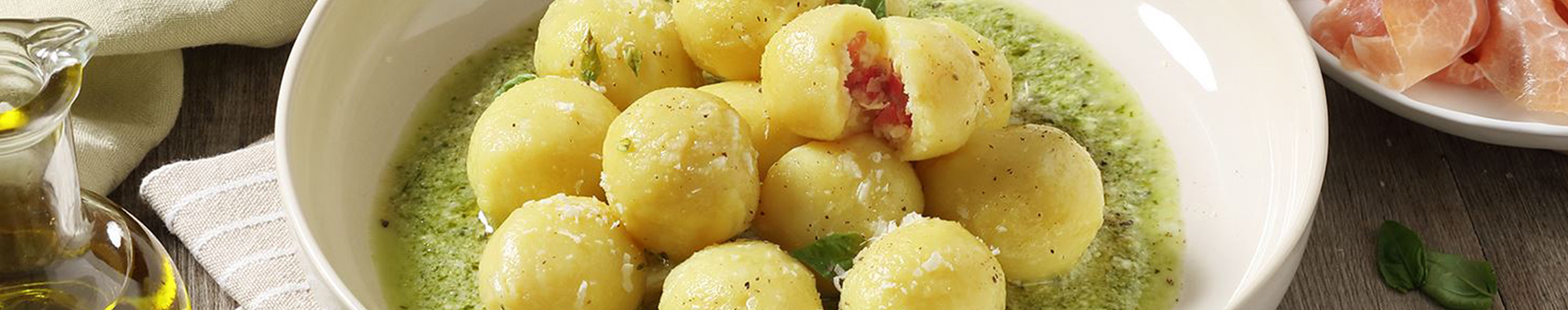 Potato Gnocchi Filled with Grana Padano Riserva and Prosciutto, garnished with Courgette and Basil Pesto