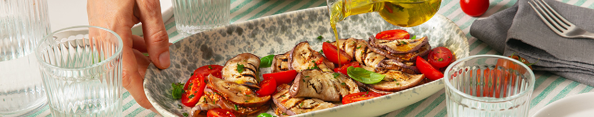Slice the aubergines and grill them on both sides for a few minutes. Put the tomato and Grana Padano mixture on the aubergine slices and fold them in half to make ravioli-like parcels.