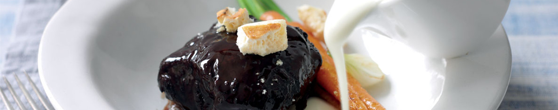 Pass the jus through a colander and remove the garlic and thyme. Put the cheeks back into the dish and cover, leaving for a few minutes. Remove the dish from the hob, and spoon the jus on top to keep the beef moist and shiny. In the meantime, melt the Grana Padano and the 10g butter in the milk in a separate pan until completely melted. Add salt and pepper to taste – leave on the side. Blanch the carrots and button onions in salted boiling water for a few seconds and sauté in a little butter with salt and pepper to season.