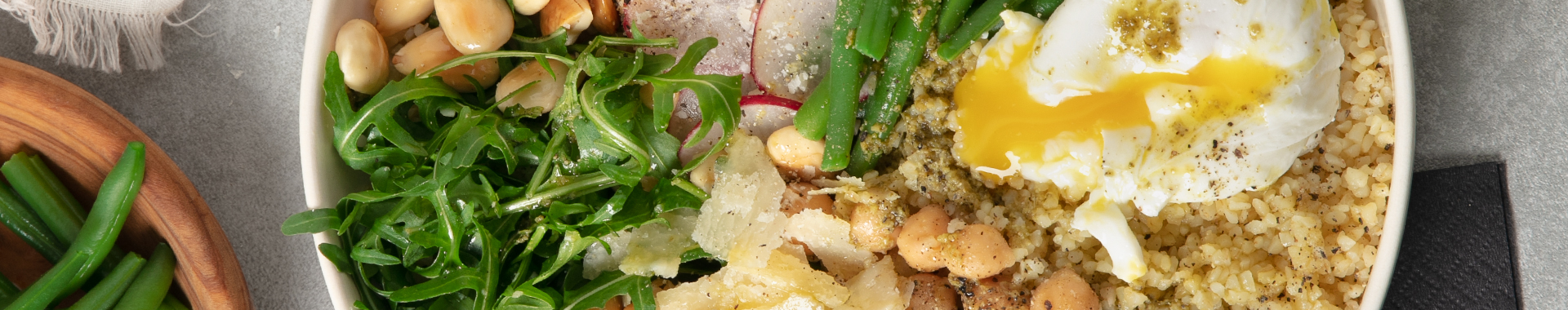 Couscous with poached egg, green beans, roasted almonds, chickpeas and basil, with Grana Padano Riserva