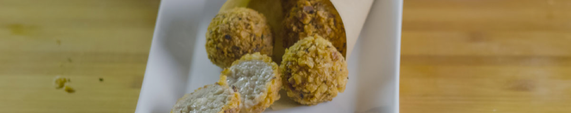 Roll the meatballs in the flour, then in the egg and lastly in the bread crust. Fry the meatballs at 60°C for 3/4 minutes and serve in a cone of straw paper.
