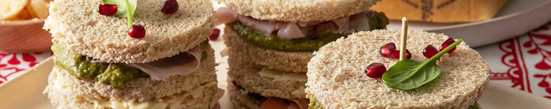 To make the mini gourmet panettone, Layer the bread circles with the various ingredients: olive paté with prosciutto slices, mayonnaise with Grana Padano flakes, pesto with cooked ham.