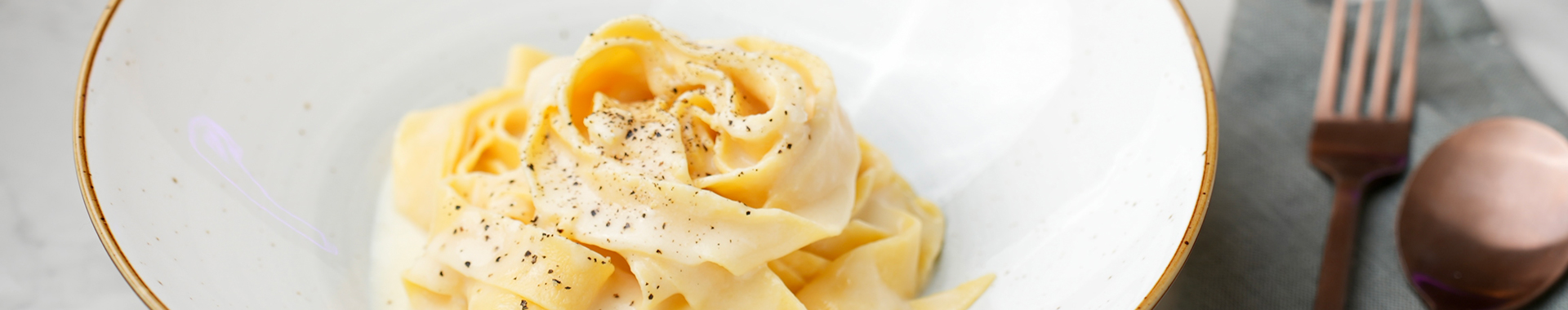 Away from the stove, toss the hot fettuccine with the softened butter in a heatproof tray/bowl, then add a ladle of pasta water and the very finely grated cheese. Start mixing slowly and build some momentum. What looks like a watery mess will soon start to come together as the gentle remaining heat of the water will melt the cheese and butter and create a creamy emulsion. This is your magical sauce!