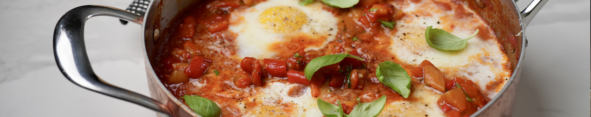 Poached eggs in tomato sauce and spicy roast peppers with Grana Padano Riserva
