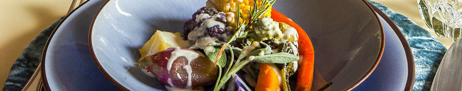 1 purple carrot, peeled and cut lengthways into 4 pieces 1 orange carrot, peeled and cut lengthways into 4 pieces 2 purple potatoes, well washed, scrubbed, and sliced (2-3 cm) 300 g different coloured cauliflower florets 200 g pumpkin, peeled, seeded and cut into pieces 4 shallots, peeled, left whole 2 Jerusalem artichokes, well washed, cut into pieces 1 medium beetroot, peeled and cut into wedges 1/2 fennel cut lengthways into 8 pieces ¼ celeriac, cut into pieces Thyme Sage Rosemary Extra virgin olive oil Sea salt Pepper