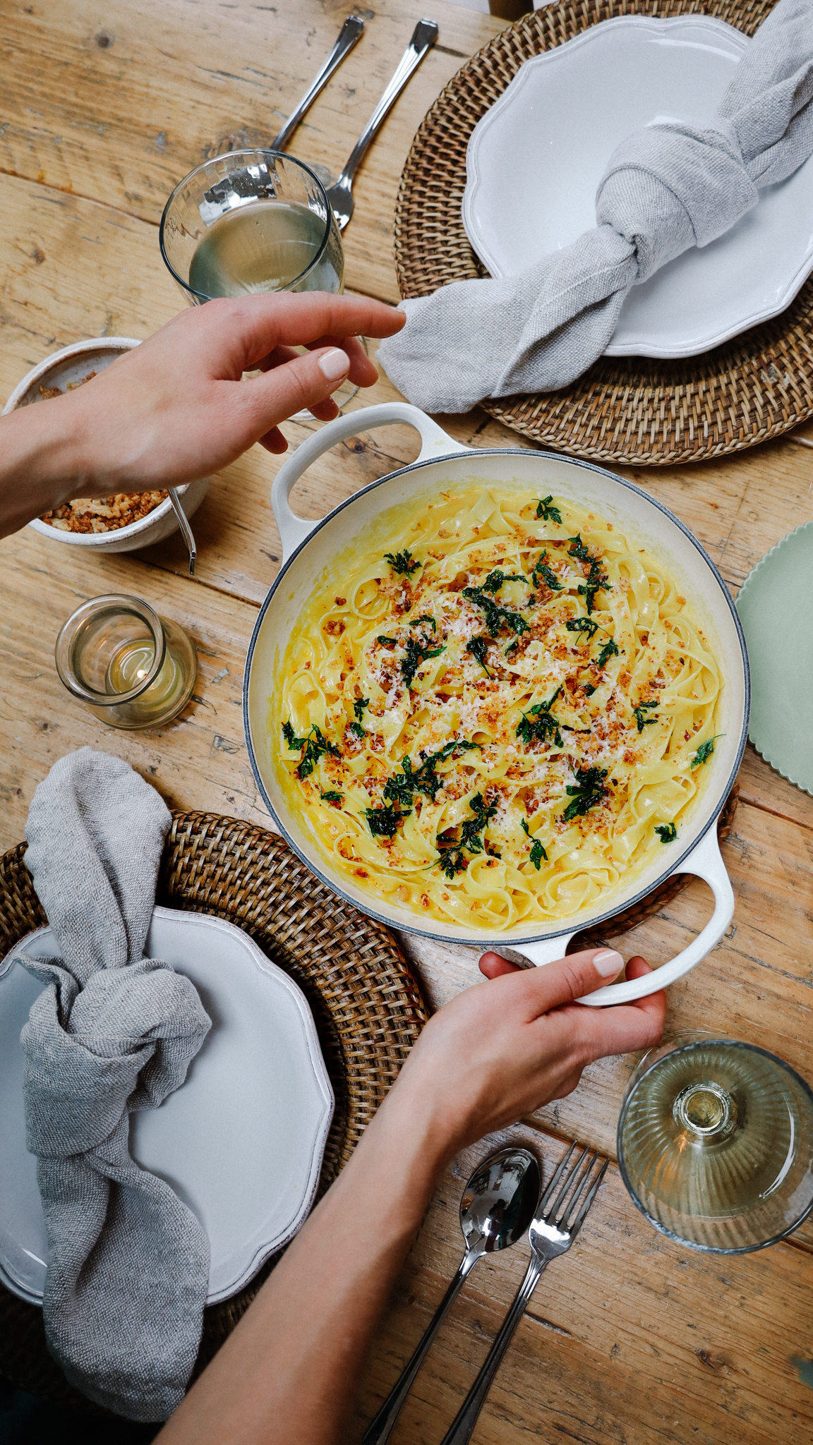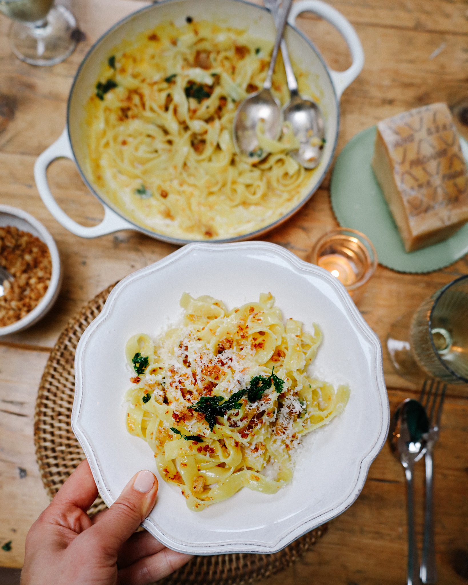 Saffron Tagliatelle with Grana Padano Breadcrumbs and Crispy Parsley. This is such a quick and delicious pasta dish for a dinner party of date night. The Grana Padano and saffron create a beautifully rich sauce and the crispy breadcrumbs have a slightly chilli kick and rich nuttiness from the Grana Padano. I love the GranaPadano Riserva for this. Aged for over 20 months it has such a good depth of flavour and really makes this sauce. Also I highly recommend making your breadcrumbs this way. Really adds something extra.