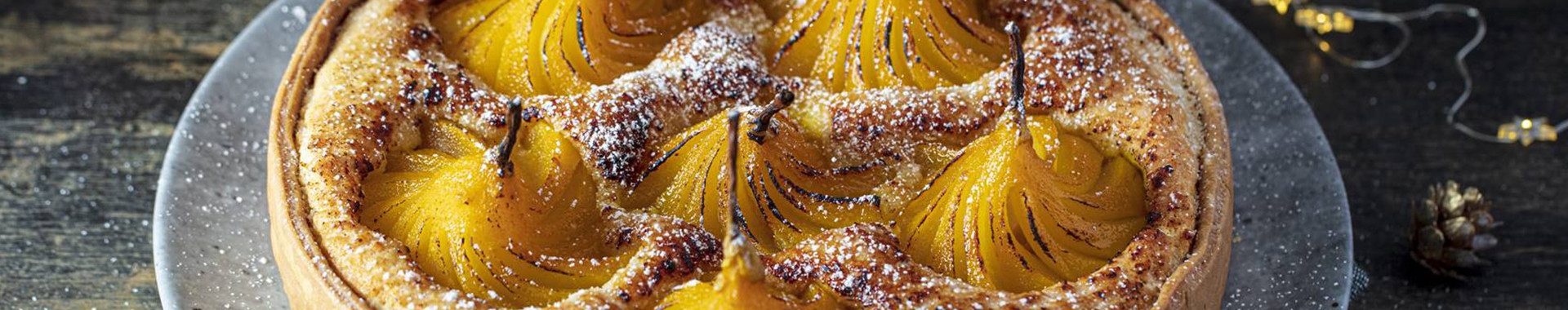 Spread the cooked pears over the base of the tart. Pour over the frangipane mixture until the tart case is filled to the top.