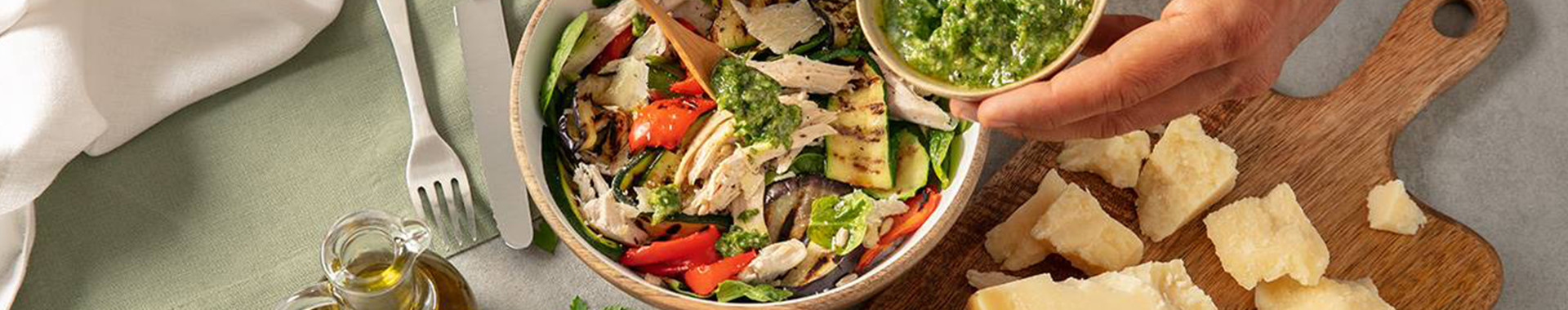 Tasty pulled roast chicken salad with grilled seasonal vegetables, green sauce, and Grana Padano shavings