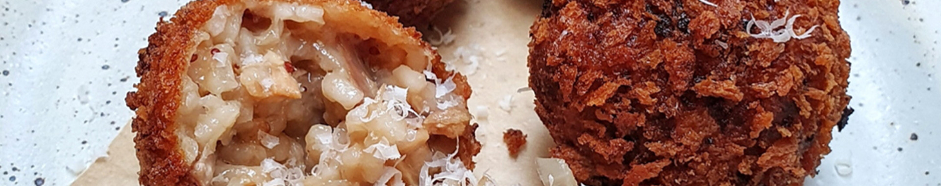 Once cold, scoop a spoonful of risotto and form it into a ball the size of a golf ball. Repeat until all the risotto is gone – or you can keep half of the mixture in the fridge until it is ready to form into balls as it is easier to handle when cold. Heat oil in a saucepan to 160C – a breadcrumb should bubble within a couple of seconds of being added to it. In three separate bowls, prepare the flour, egg and breadcrumbs. Take a risotto ball, place it in the flour and then the egg and finally the breadcrumbs. Remove to a plate and rest for five minutes. Repeat until all the risotto balls are all coated.