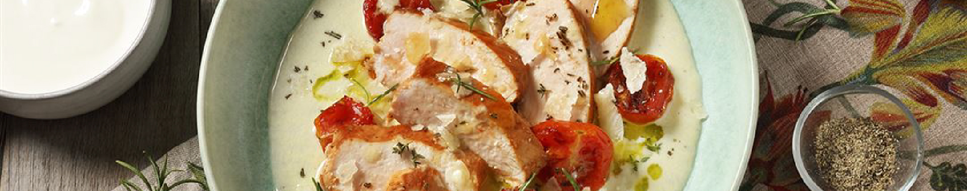 Slice the turkey then serve with its sauce and the roasted tomatoes, garnished with shaved petals of Grana Padano.