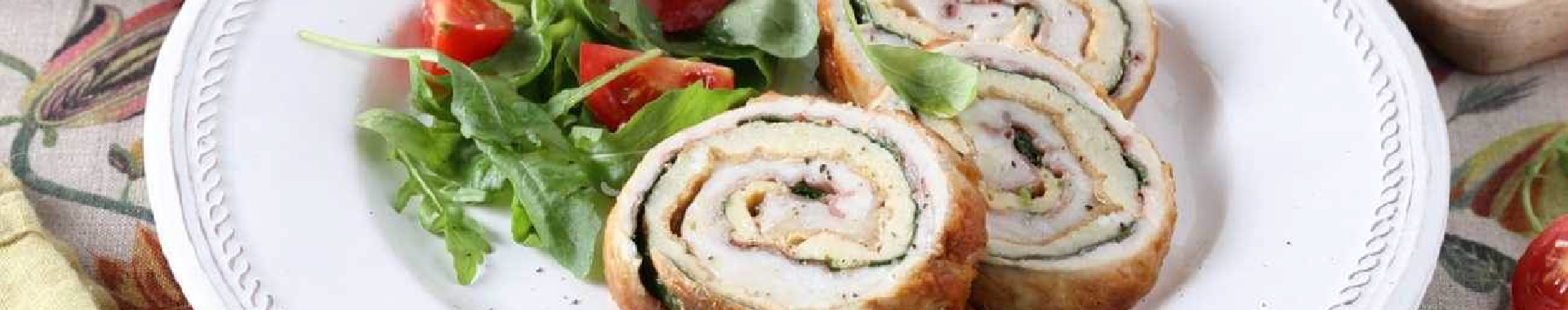 Butterfly the turkey breast trying to create a single slice, pound it flat and fill it with spinach, grated Grana Padano, ham and the frittata.