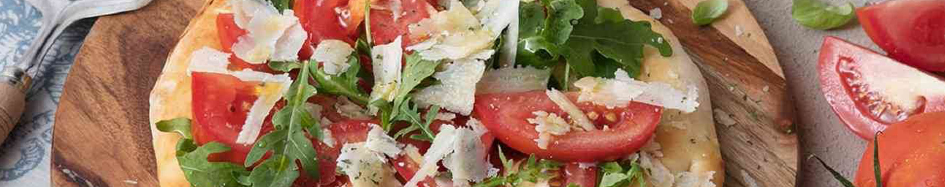 White pizza with fresh tomatoes, rocket and shavings of Grana Padano Riserva