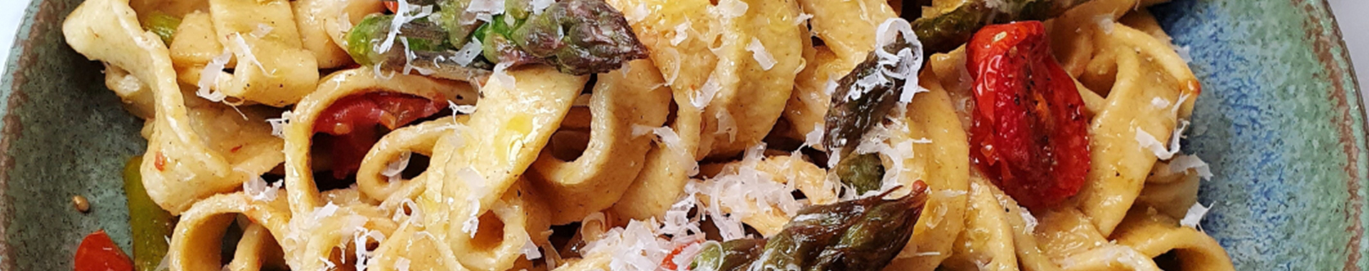 Transfer to the frying pan and toss to cover in the buttery water. Add a good handful of Grana Padano Riserva and wait until it’s melted on top before you toss to cover and distribute evenly. Once it’s all mixed in, add pepper. Toss and serve immediately.