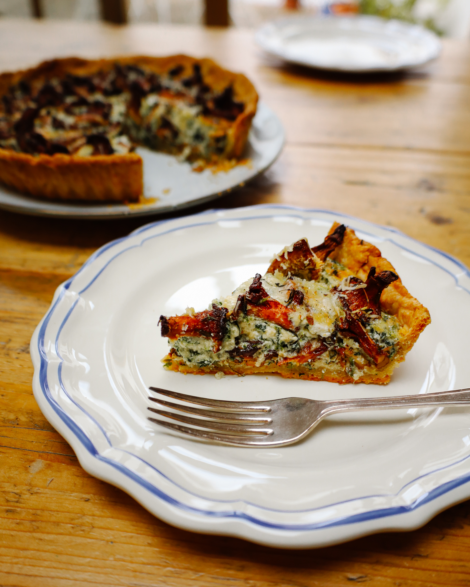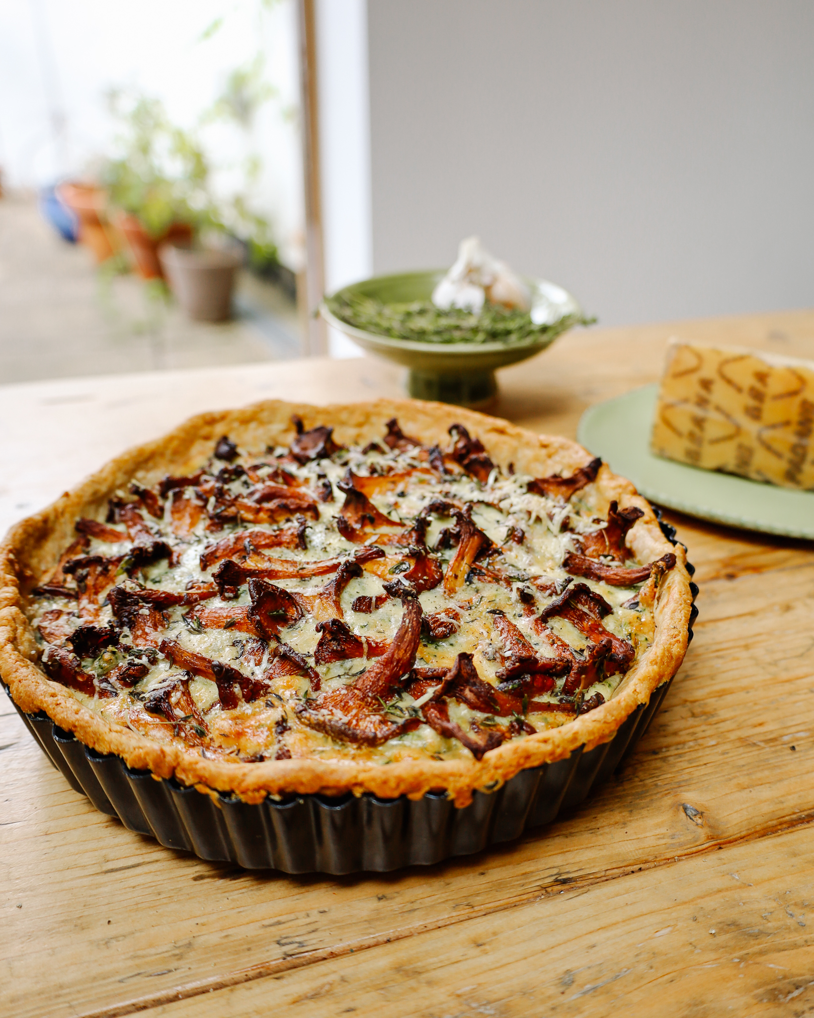 This tart works beautifully for entertaining or even a midweek supper. The Grana Padano adds a flavourful almost nuttiness to the pastry and the filling is rich in flavour of wild mushrooms, thyme and more Grana Padano. I use winter girolles for this but any mushroom would work well.