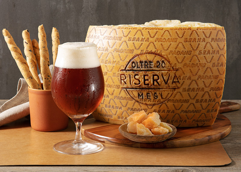 Their robust body and strong aromas and flavours pairs well with Grana Padano PDO Riserva aged over 20 months. Specifically, their alcohol and carbonation work to balance the fatty component of the cheese. Their rounded quality in the mouth do the same with the cheese’s savouriness and their aromatic toasted notes meld well with the cheese’s corresponding aromatic qualities. A harmonious and intensely pleasant encounter.