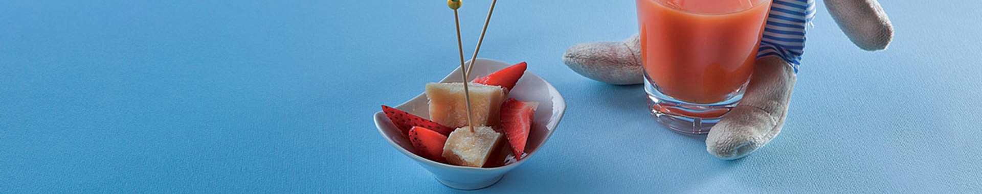 Peel the carrots and blend with the celery, apples, pears and honey to make a smoothie. Quarter the strawberries and serve with Grana Padano, cut into slivers or small chunks, and the smoothie.