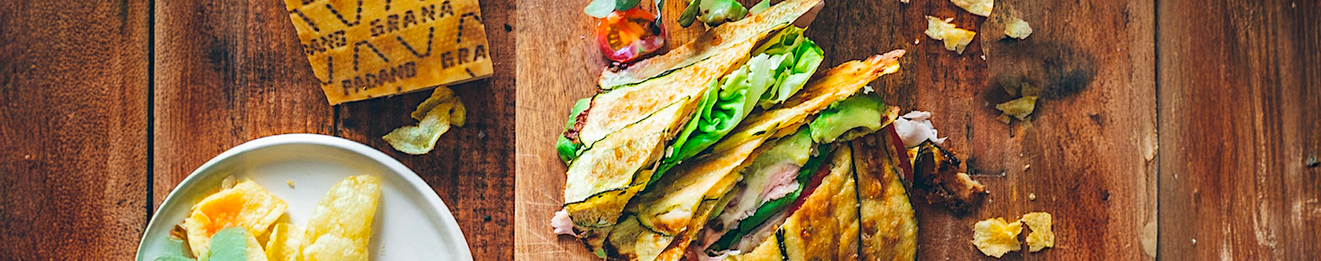Colocamos 8 tiras de calabacín a lo largo sobre la tira larga de queso. Para el otro sándwich colocamos 6 ruedas de boniato, manteniéndolas lo más juntas posible para formar un rectángulo, y repetimos con el otro rectángulo. Sazonamos al gusto y luego añadimos otra capa fina de queso Grana Padano rallado sobre las verduras.