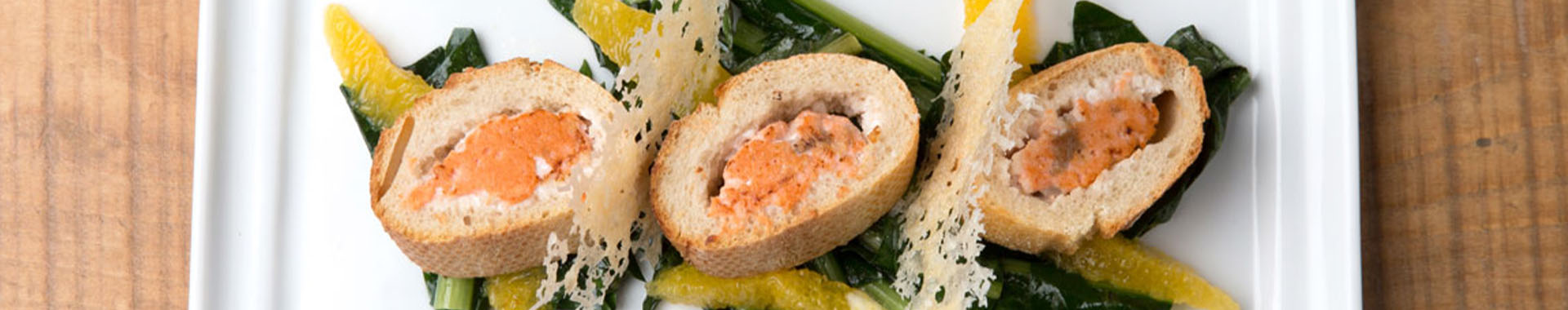 Croutons rellenos de salmón, rúcula, naranjas y Grana Padano