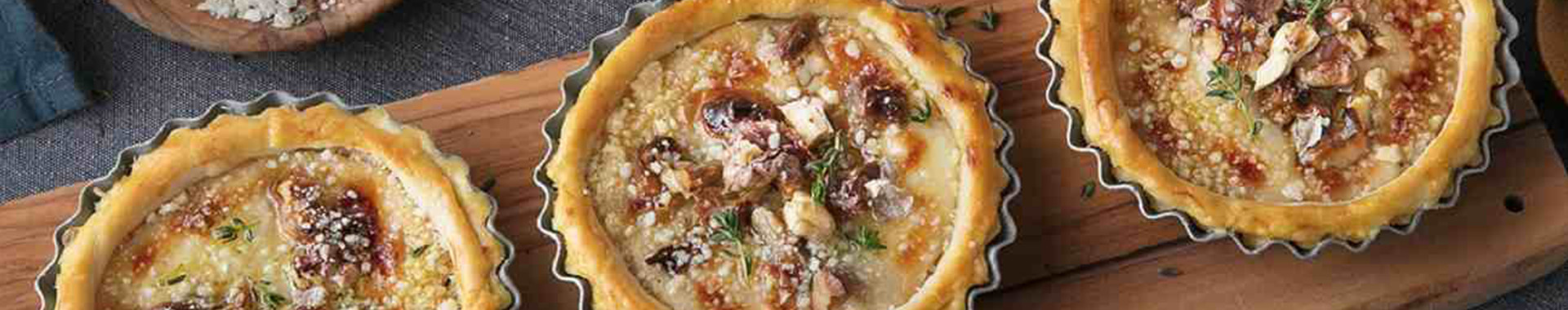En un bol mezclar los huevos con la nata fresca, la ricotta y el Grana Padano rallado, sal y pimienta. Añadir las nueces picadas en trozos grandes y las hojas de tomillo mezclando bien. Forrar 4 moldes para flanes con la masa quebrada, rellenarlos con la mezcla de queso y nueces y cocer en el horno precalentado a 180°C durante 20-25 minutos. Servir los flanes tan pronto como se entibien.