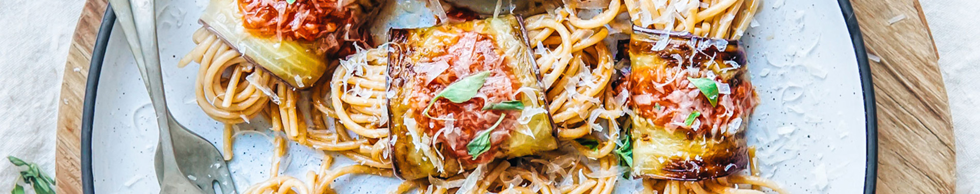 Rellenar la berenjena con la pasta, enrollar y servir con queso Grana Padano encima.