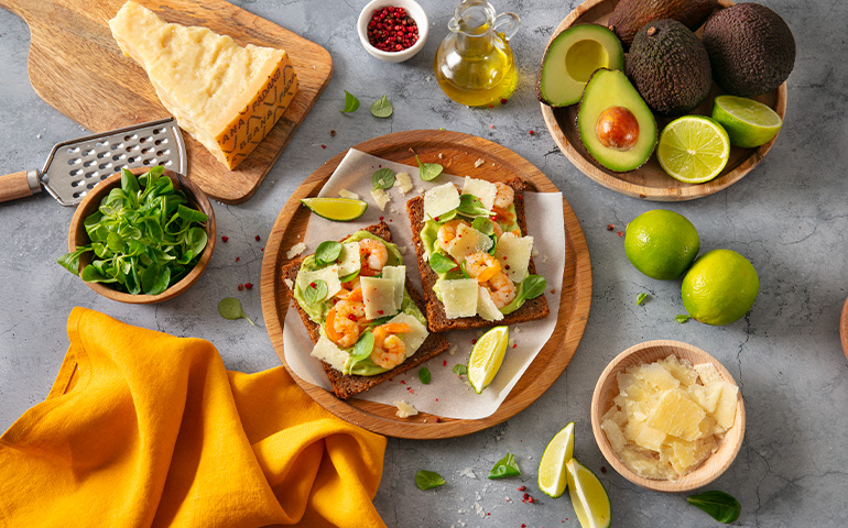 Cuando los huevos estén listos, colocar uno por rodaja, para después terminar con las láminas de Grana Para DOP. ¡Vuestros avocado toast están listos!