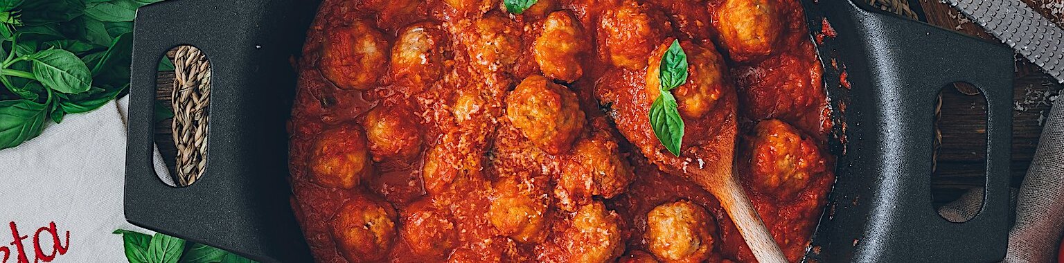 En una cacerola poner nuestra salsa de tomate casera y añadir las albóndigas. Añadir un manojo de albahaca en trozos y dejar hervir a fuego suave. Añadir más Grana Padano justo antes de servirlas ¡y listo!