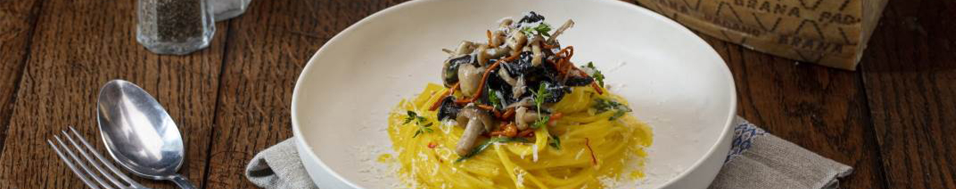 Espagueti con Grana Padano Riserva, azafrán y ragu de setas salvajes