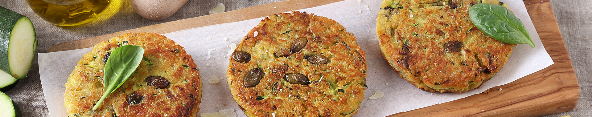 Rallar los calabacines y ponerlos en un bol; añadir la quinoa, el Grana Padano rallado, las semillas de calabaza, una patata cocida pelada, un huevo y un chorrito de aceite de oliva virgen extra.