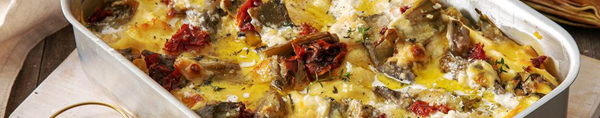 Lasaña blanca con alcachofas, salsa béchamel ligera y Grana Padano