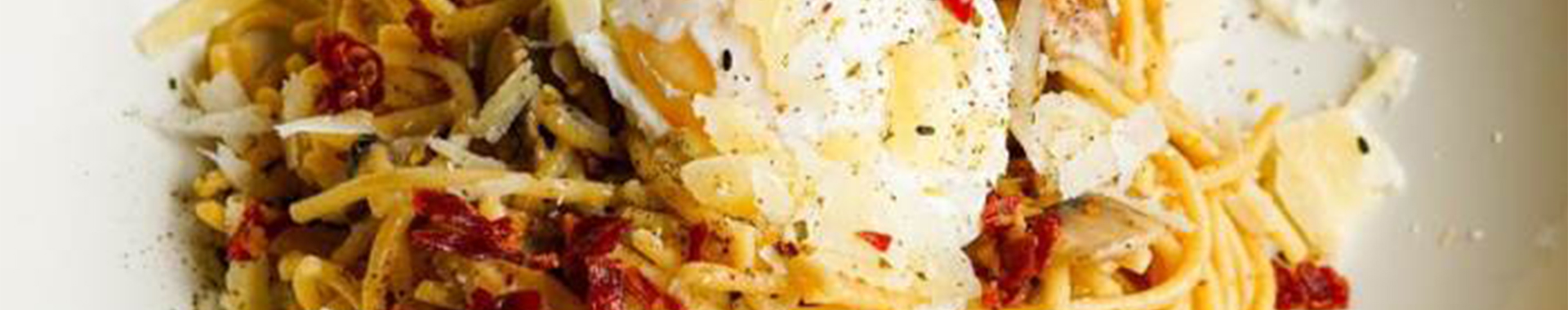 Pasta con salsa de Grana Padano, jamón y huevo pochado