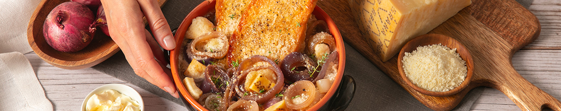 Sopa de cebolla con picatostes y palomitas de corteza de Grana Padano